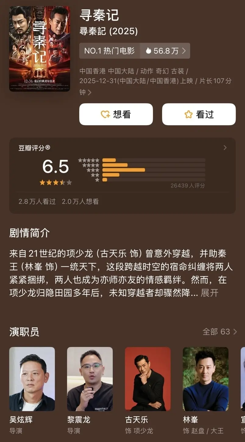 总的来讲,《寻秦记》当一部6分的喜剧片看还行,剧情就不要过多计较了。